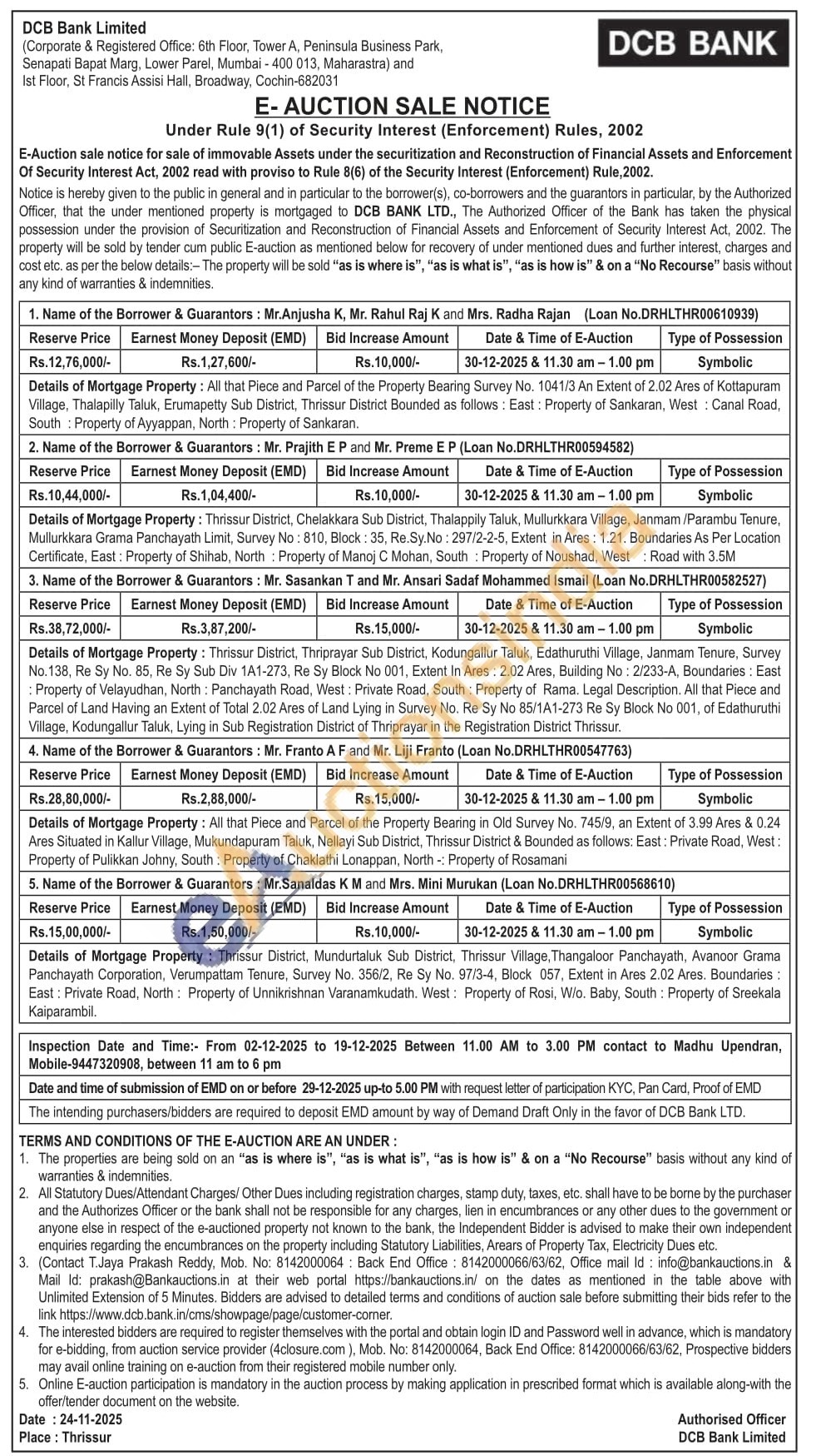 Thrissur District, Mundurtaluk Sub District, Thrissur Village, Thangaloor Panchayath, Avanoor Grama Panchayath Corporation, Verumpattam Tenure, Survey No. 356/2, Re Sy No. 97/3-4, Block 057, Extent in Ares 2.02 Ares. Boundaries: East: Private Road, North: Property of Unnikrishnan Varanamkudath. West: Property of Rosi, W/o. Baby, South: Property of Sreekala Kaiparambil.