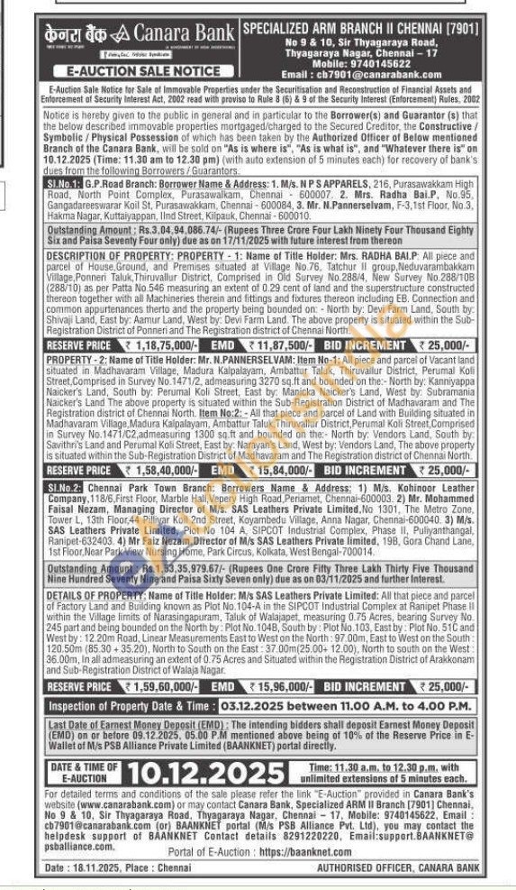 DETAILS OF PROPERTY: Name of Title Holder: M/s SAS Leathers Private Limited: All that piece and parcel of Factory Land and Building known as Plot No. 104-A in the SIPCOT Industrial Complex at Ranipet Phase II within the Village limits of Narasingapuram, Taluk of Walajapet, measuring 0.75 Acres, bearing Survey No. 245 part and being bounded on the North by: Plot No. 1048, South by: Plot No.103, East by: Plot No. 51C and West by: 12.20m Road, Linear Measurements East to West on the North: 97.00m, East to West on the South: 120.50m (85.30-35.20), North to South on the East: 37.00m(25.00-12.00), North to south on the West: 36.00m, In all admeasuring an extent of 0.75 Acres and Situated within the Registration District of Arakkonam and Sub-Registration District of Walaja Nagar.