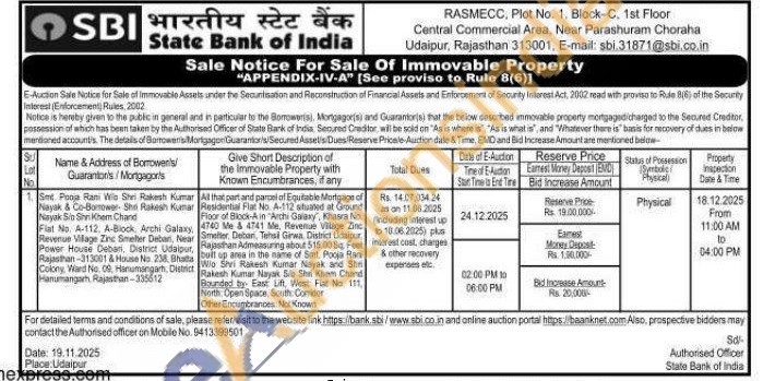 All that part and parcel of Equitable Mortgage of Residential Flat No. A-112 situated at Ground Floor of Block-A in "Archi Galaxy", Khasra No 4740 Me & 4741 Me, Revenue Village Zinc Smelter Debian, Tehsil Ginwa District Udaipur Hansthan Admeasuring about Hajasthan Admeasuring about 515.00 sq Feer bult up ansa in the name of Simt. Pooja Rani Wio Sivi Rakesh Kumar Nayak and Sh Rakesh Kumar Naya Sio Ghi Khem Chand Bounded by East Lift, West Flar No. 111, North Open Space, South Corridor Other Encumbrances Not Known