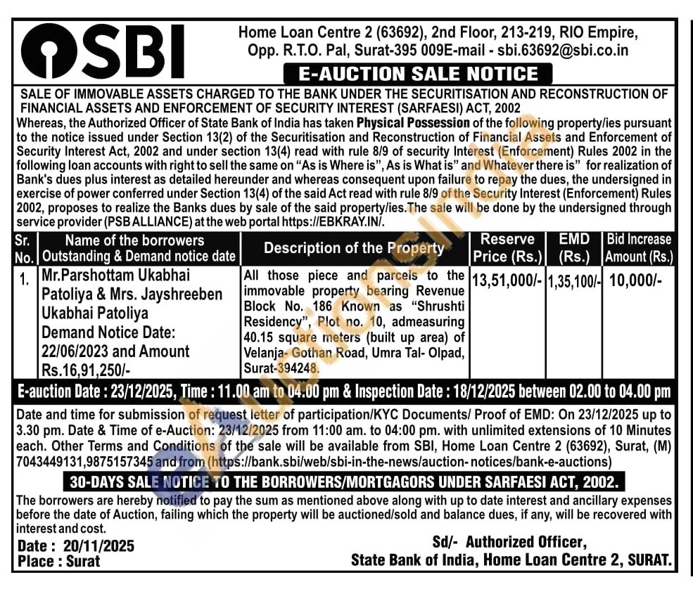 All those piece and parcels to the immovable property bearing Revenue Block No. 186 Known as "Shrushti Residency", Plot no. 10, admeasuring 40.15 square meters (built up area) of Velanja- Gothan Road, Umra Tal- Olpad, Surat-394248