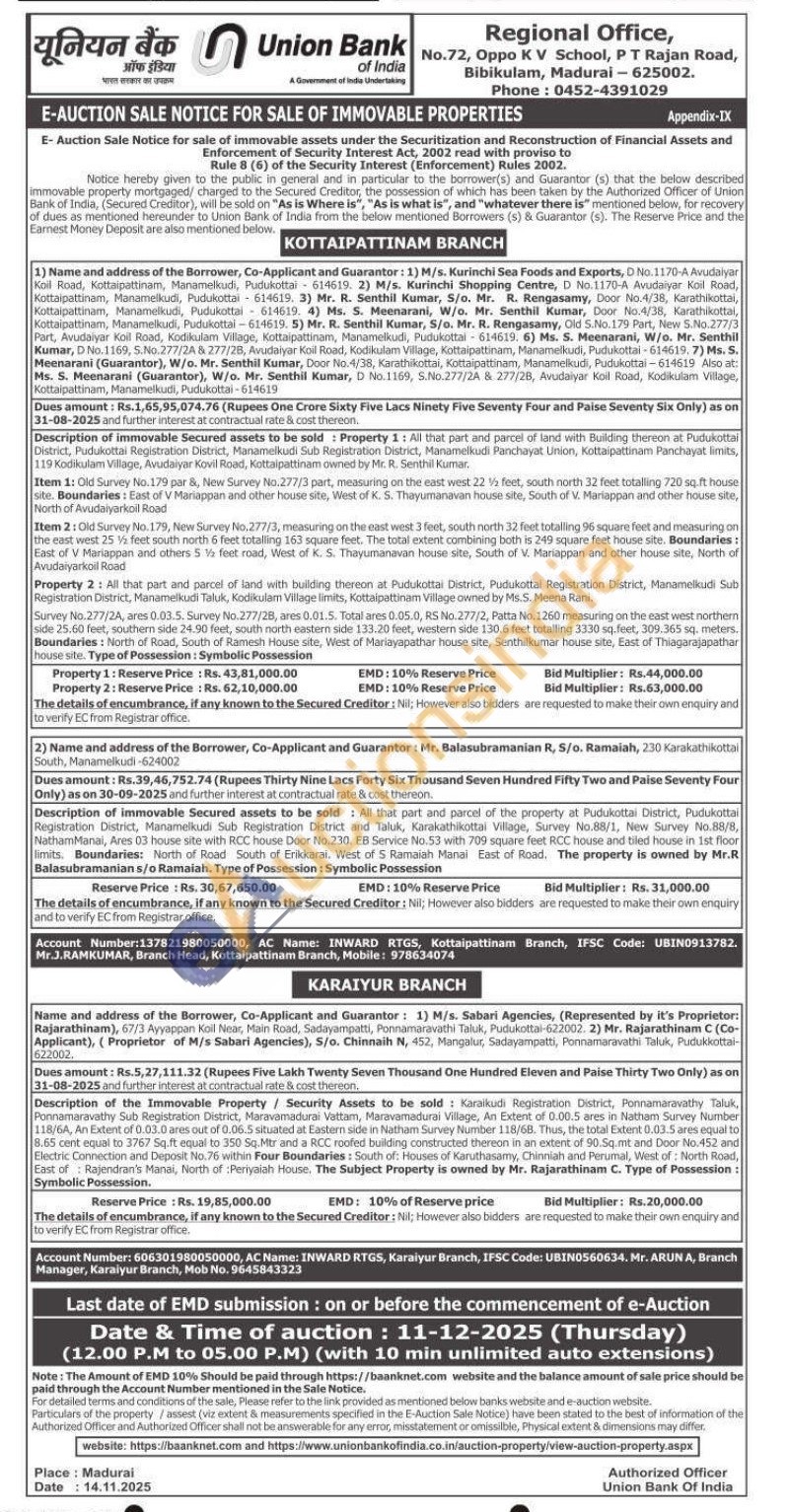 Description of the Immovable Property / Security Assets to be sold Karaikudi Registration District, Ponnamaravathy Taluk, Ponnamaravathy Sub Registration District, Maravamadurai Vattam, Maravamadurai Village, An Extent of 0.00.5 ares in Natham Survey Number 118/6A, An Extent of 0.03.0 ares out of 0.06.5 situated at Eastern side in Natham Survey Number 118/68. Thus, the total Extent 0.03.5 ares equal to 8.65 cent equal to 3767 Sq.ft equal to 350 Sq.Mtr and a RCC roofed building constructed thereon in an extent of 90.5q.mt and Door No.452 and Electric Connection and Deposit No.76 within Four Boundaries: South of: Houses of Karuthasamy, Chinniah and Perumal, West of: North Road, East of Rajendran's Manai, North of Periyalah House, The Subject Property is owned by Mr. Rajarathinam C. Type of Possession: Symbolic Possession.