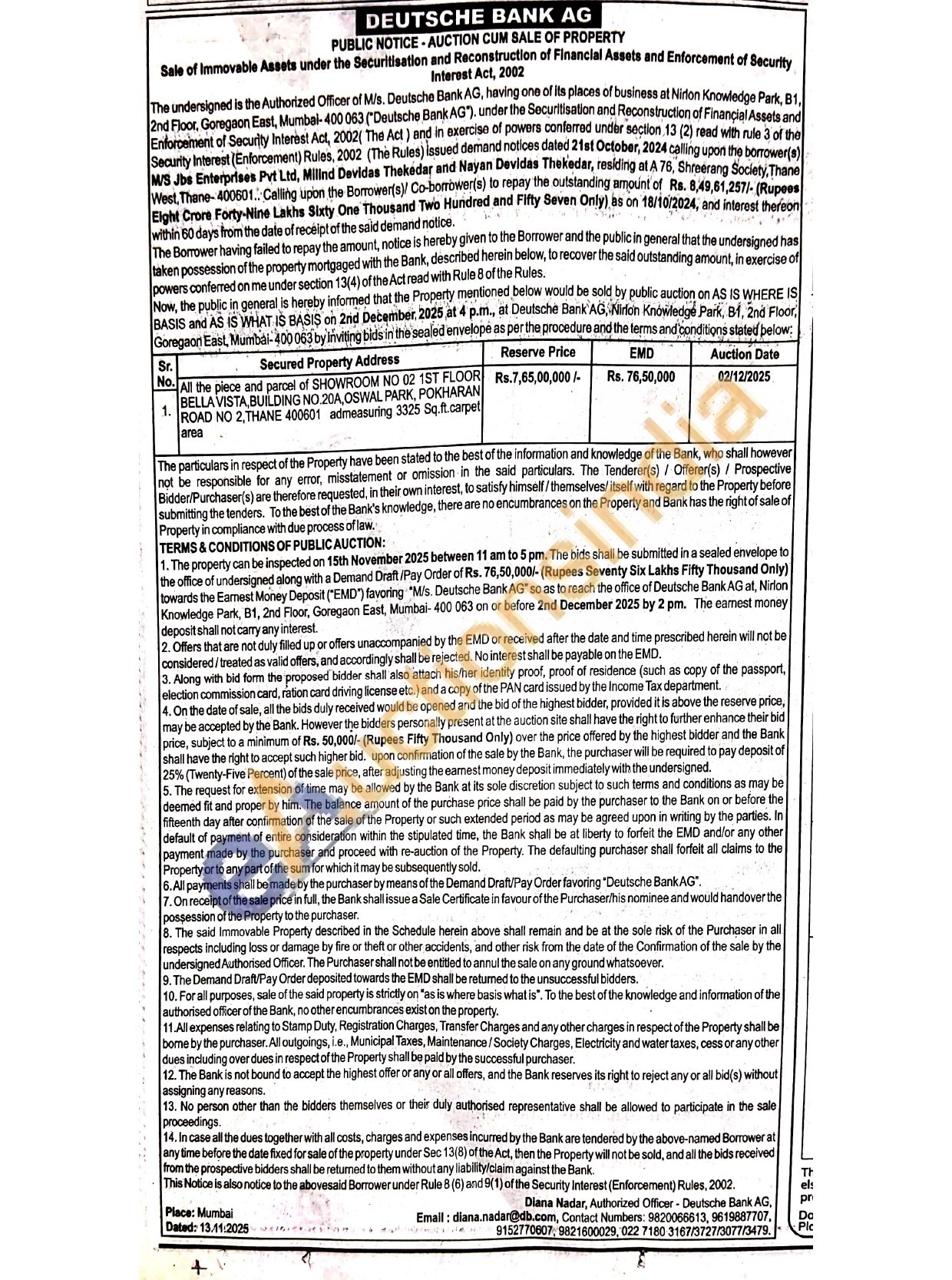 All the piece and parcel of SHOWROOM NO 02 1ST FLOOR BELLA VISTA, BUILDING NO.20A, OSWAL PARK, POKHARAN ROAD NO 2, THANE 400601 admeasuring 3325 Sq.ft.carpet area
