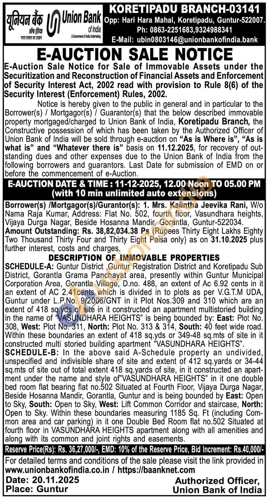 SCHEDULE-A: Guntur District, Guntur Registration District and Koretipadu Sub District, Gorantla Grama Panchayat area, presently within Guntur Municipal Corporation Area, Gorantla Village, D.no. 488, an extent of Ac 6.92 cents in it an extent of AC 2.41cents which is divided in to plots as per V.G.T.M UDA, Guntur under L.P.No. 9/2006/GNT in it Plot Nos.309 and 310 which are an extent of 418 sq.yds of site in it constructed an apartment multistoried building in the name of "VASUNDHARA HEIGHTS" is being bounded by: East: Plot No. 308, West: Plot No. 311, North: Plot No. 313 & 314, South: 40 feet wide road. Within these boundaries an extent of 418 sq.yds or 349-48 sq.mts of site in it constructed multi storied building apartment "VASUNDHARA HEIGHTS". SCHEDULE-B: In the above said A-Schedule property an undivided, unspecified and indivisible share of site and extent of 412 sq.yards or 34-44 sq.mts of site out of total extent 418 sq.yards of site, in it constructed an apart-ment under the name and style of"VASUNDHARA HEIGHTS" in it one double bed room flat bearing flat no.502 Situated at Fourth Floor, Vijaya Durga Nagar, Beside Hosanna Mandir, Gorantla, Guntur and is being bounded by East: Open to Sky, South: Open to Sky, West: Lift Common Corridor and staircase, North: Open to Sky. Within these boundaries measuring 1185 Sq. Ft (including Com-mon area and car parking) in it one Double Bed Room flat no.502 Situated at fourth floor in VASUNDHARA HEIGHTS apartment along with all amenities and along with its common and joint rights and easements.