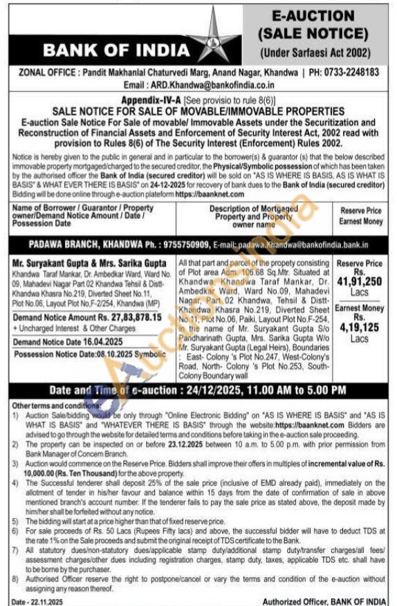 All that part and parcel of the propety consisting of Plot area Adm. 106.68 Sq.Mtr. Situated at Khandwa, Khandwa Taraf Mankar, Dr. Ambedkar Ward, Ward No.09, Mahadevi Nagar, Part 02 Khandwa, Tehsil & Distt-Khandwa Khasra No.219, Diverted Sheet No. 11, Plot No.06, Paiki, Layout Plot No.F-254, in the name of Mr. Suryakant Gupta S/o Pandharinath Gupta, Mrs. Sarika Gupta WioMr. Suryakant Gupta (Legal Heirs), Boundaries East- Colony 's Plot No.247, West-Colony's Road, North Colony 's Plot No.253, South-Colony Boundary wall