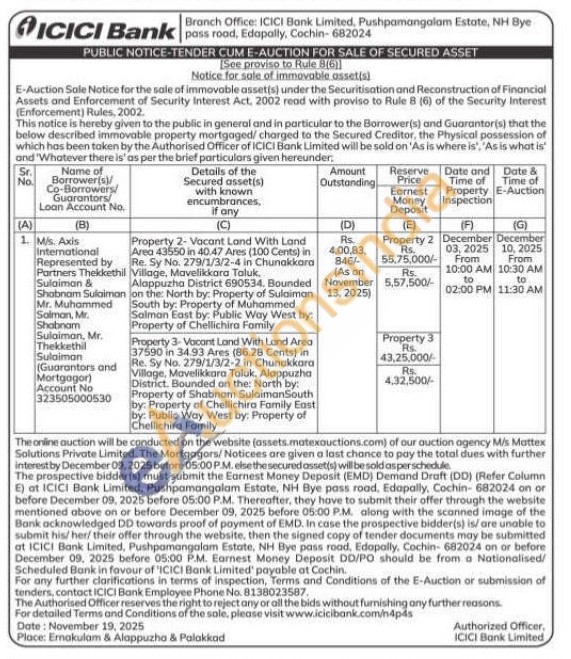 Property 2- Vacant Land With Land Area 43550 in 40.47 Ares (100 Cents) in Re. Sy No. 279/1/3/2-4 in Chunakkara Alappuzha District 690534. Bounded Village, Mavelikkara Taluk on the: North by: Property of Sulaiman South by: Property of Muhammed Salman East by: Public Way West by: Property of Chellichira Family