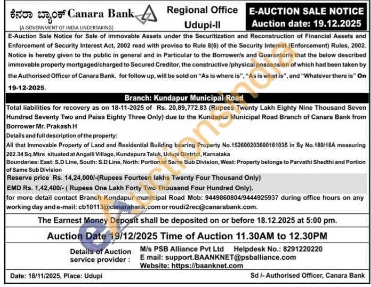 All that Immovable Property of Land and Residential Building bearing Property No.152600203600161035 in Sy No. 189/18A measuring 202.34 Sq.Mtrs situated at Angalli Village, Kundapura Taluk, Udupi District, KarnatakaBoundaries: East: S.D Line, South: S.D Line, North: Portion of Same Sub Division, West: Property belongs to Parvathi Shedthi and Portion of Same Sub Division
