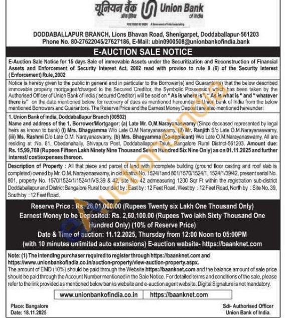 Description of Property: All that piece and parcel of land with incomplete building (ground floor casting and roof slab is completed) owned by Mr. O.M. Narayanaswamy, in old khatha No. 1524/1and 801/1570/1524/1, 1524/1/39/42, present serial No. 801, property No. 1570/1524/1/1524/1/VS.39 & 42, site No. 42 admeasuring 1200 Sqr Ft within the registration sub-district Doddaballapur and District Bangalore Rural bounded by: East by: 12 Feet Road, West by: 12 Feet Road, North by: Site No. 39. South by: 12 Feet Road.