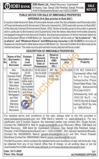 CTS NO 5494/A/1, Commercial office Hall No F-1, First Floor, Indraprastha Plaza, Karad Naka Road, Vita, Sangli, Maharashtra Pin Code-415311. Admeasuring built up 1603.59 Sq.ft le 149.03 Sq.mls & Super built up 156.67 Sq mts. e. 1686.46 Sq.ft.