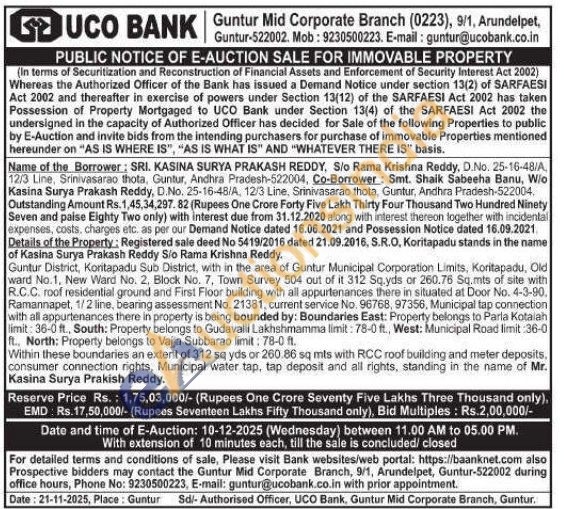 Guntur District, Koritapadu Sub District, with in the area of Guntur Municipal Corporation Limits, Koritapadu, Old ward No.1, New Ward No. 2, Block No. 7, Town Survey 504 out of it 312 Sq.yds or 260.76 Sq.mts of site with R.C.C. roof residential ground and First Floor building with all appurtenances there in situated at Door No. 4-3-90, Ramannapet, 1/2 line, bearing assessment No. 21381, current service No. 96768, 97356, Municipal tap connection with all appurtenances there in property is being bounded by: Boundaries East: Property belongs to Parla Kotaiah limit: 36-0 ft., South: Property belongs to Gudavalli Lakhshmamma limit: 78-0 ft., West: Municipal Road limit :36-0 ft., North: Property belongs to Vajja Subbarao limit: 78-0 ft.