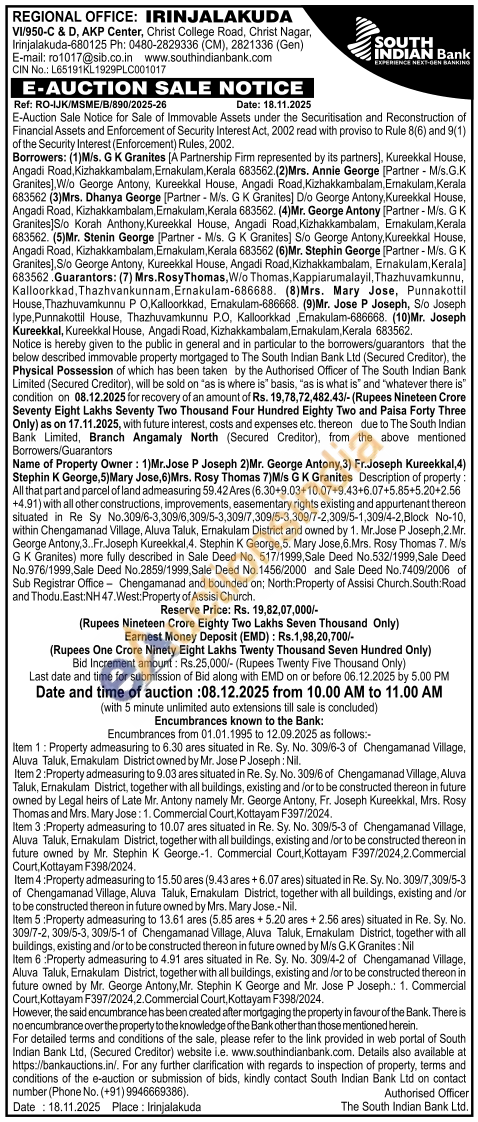 All that part and parcel of land admeasuring 59,42 Ares (6.30+9.03+10.07+9.43+6.07+5.85+5.20+2.56 +4.91) with all other constructions, improvements, easementary rights existing and appurtenant thereon situated in Re Sy No.309/6-3,309/6,309/5-3,309/7,309/5-3,309/7-2,309/5-1,309/4-2,Block No-10, within Chengamanad Village, Aluva Taluk, Ernakulam District and owned by 1. Mr. Jose P Joseph, 2.Mr. George Antony, 3..Fr. Joseph Kureekkal. 4. Stephin K George, 5. Mary Jose, 6.Mrs. Rosy Thomas 7. Mis GK Granites) more fully described in Sale Deed No. 517/1999, Sale Deed No.532/1999, Sale Deed No.976/1999 Sale Deed No.2859/1999, Sale Deed No.1456/2000 and Sale Deed No.7409/2006 of Sub Registrar Office Chengamanad and bounded on; North: Property of Assisi Church. South Road