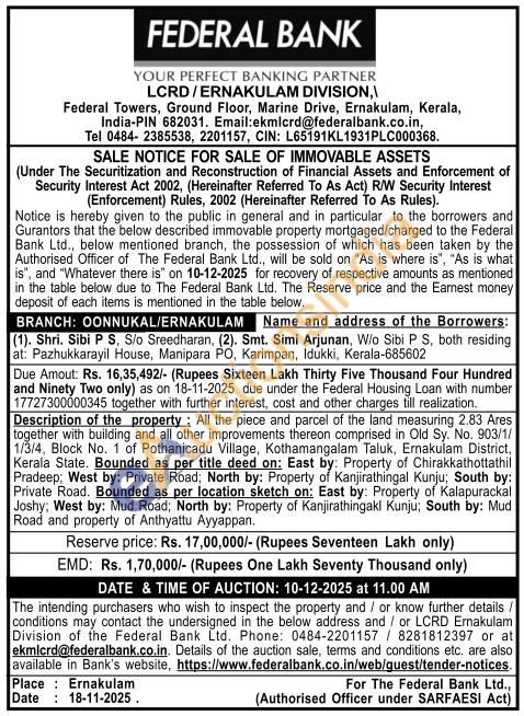 Description of the property: All the piece and parcel of the land measuring 2.83 Ares together with building and all other improvements thereon comprised in Old Sy. No. 903/1/1/3/4, Block No. 1 of Pothanicadu Village, Kothamangalam Taluk, Ernakulam District, Kerala State. Bounded as per title deed on: East by: Property of Chirakkathottathil Pradeep; West by: Private Road; North by: Property of Kanjirathingal Kunju; South by: Private Road. Bounded as per location sketch on: East by: Property of Kalapurackal Joshy: West by: Mud Road; North by: Property of Kanjirathingakl Kunju; South by: Mud Road and property of Anthyattu Ayyappan.