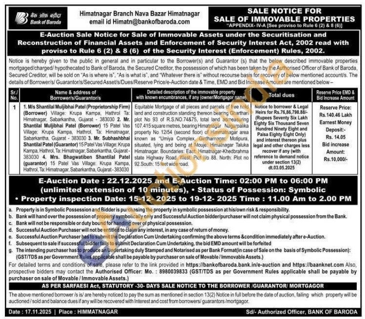 Equitable Mortgage of all pieces and parcels of free hold land and construction standing thereon bearing Gharthari plot No 93 of R.S.NO.74875, total land admeasuring 107.415 square metres, bearing Himatnagar Nagarpalika property No 12/54 (second floor) of Himmatnagar area known as "Umiya Complex, Girdhamagar, Motipura, situated, lying and being at Mouje: Himatnagar Taluka Himatnagar Boundaries: East: Himatnagar-Khedbrahma state Highway Road. West Plot No 88. North: Plot no 92 South: 15 feet wide road.