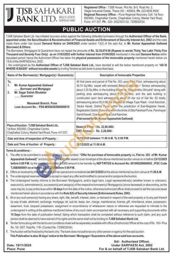 All that piece and parcel of Flat No. 303 upon Third Floor, admeasuring about 38.74 Sq.Mirs, carpet with enclosed Balcony attached Terrace admeasuring about 3.30 Sq. Mtrs. in the building known as "Swayambhu Shrushti along with parking area admeasuring about 9.29 Sq.Mtrs and the said building s constructed upon land admeasuring about 25 Aar out of Gat No. 62 totally admeasuring about 00 H 98. Aar situated at Village Tupe Wasti-Uruli Kanchan Taluka Havel, District Pune, within the jurisdiction of Sub-Registrar Havel Registration District Pune and within the limits of Zilla Parishad Pune, Panchayat Samiti Haveli, Grampanchayat Uruli Kanchan
