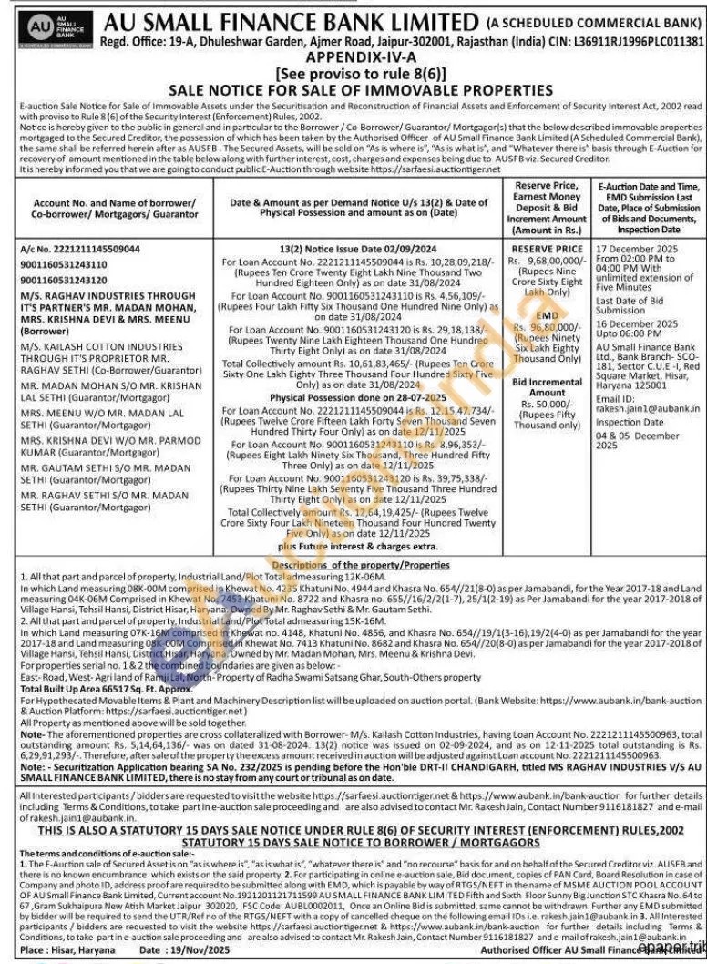 1. All that part and parcel of property, Industrial Land/Plot Total admeasuring 12K-06M. In which Land measuring 08K-00M comprised in Khewat No. 4235 Khatuni No. 4944 and Khasra No. 654//21(8-0) as per Jamabandi, for the Year 2017-18 and Land measuring 04K-06M Comprised in Khewat No. 7453 Khatuni No. 8722 and Khasra no. 655//16/2/2(1-7), 25/1(2-19) as Per Jamabandi for the year 2017-2018 of Village Hansi, Tehsil Hansi, District Hisar, Haryana. Owned By Mr. Raghav Sethi & Mr. Gautam Sethi. 2. All that part and parcel of property, Industrial Land/Plot Total admeasuring 15K-16M In which Land measuring 07K-16M comprised in Khewat no. 4148, Khatuni No. 4856, and Khasra No. 654//19/1(3-16),19/2(4-0) as per Jamabandi for the year 2017-18 and Land measuring 08K-00M Comprised in Khewat No. 7413 Khatuni No. 8682 and Khasra No. 654//20(8-0) as per Jamabandi for the year 2017-2018 of Village Hansi, Tehsil Hansi, District Hisar, Haryana. Owned by Mr. Madan Mohan, Mrs. Meenu & Krishna Devi. For properties serial no. 1 & 2 the combined boundaries are given as below:- East-Road, West-Agri land of Ramji Lal, North-Property of Radha Swami Satsang Ghar, South-Others property Total Built Up Area 66517 Sq. Ft. Approx. For Hypothecated Movable Items & Plant and Machinery Description list will be uploaded on auction portal. (Bank Website: https://www.aubank.in/bank-auction & Auction Platform: https://sarfaesi.auctiontiger.net) All Property as mentioned above will be sold together. Note-The aforementioned properties are cross collateralized with Borrower-M/s. Kailash Cotton Industries, having Loan Account No. 2221211145500963, total outstanding amount Rs. 5,14,64,136/- was on dated 31-08-2024. 13(2) notice was issued on 02-09-2024, and as on 12-11-2025 total outstanding is Rs. 6,29,91,293/-. Therefore, after sale of the property the excess amount received in auction will be adjusted against Loan account No. 2221211145500963 Note: - Securitization Application bearing SA No. 232/2025 is pending before the Hon'ble DRT-II CHANDIGARH, titled MS RAGHAV INDUSTRIES V/S AU SMALL FINANCE BANK LIMITED, there is no stay from any court or tribunal as on date.