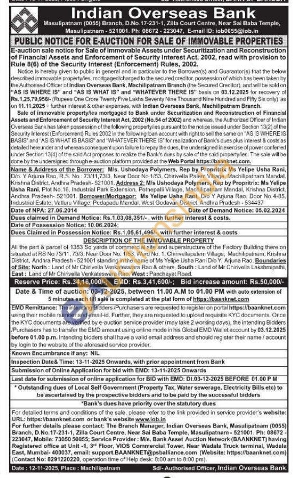 All the part & parcel of 1353 Sq yards of commercial site and superstructure of the Factory Building there on situated at RS No 73/11, 73/3, Near Door No. 1/53, Ward No. 1, Chirivellapalem Village, Machilipatnam, Krishna District, Andhra Pradesh-521001 standing in the name of Ms Yelipe Usha Rani Dio Y. Arjuna Rao. Boundaries of Site: North: Land of Mr Chirivella Venkateswara Rao & others. South: Land of Mr Chirivella Lakshmipathi, East: Land of Mr Chirvella Venkateswara Rao, West: Panchayat Road