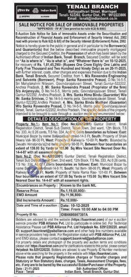 Property No.1:- Item No.1: (Doc No:4282/2001) Guntur District, Tenali Registration District, Tenali Sub District, Tenali Town, 2nd ward, 12th Block, T.S No. 333, Ac 0.26 cents, T.S No. 334, Ac 0.11 Cents boundaries as follows: East: Municipal Bazar by name Balijepallivari street-14-3 Ft, South: Property of Shaik Meera Vali-96-00 Ft, West: Property of Railway's- 10-00 Ft, North: Bounded by Devathi Himabindu's(2nd Item) property 98-08 Ft, Between four boundaries an extent of 138.00 Sq Yards or 115.90 Sq Mtrs Vacant Site Nearest Door No. 14-4-87 with all easement rights. Item No.2: (Doc No:4283/2001) Guntur District, Tenali Registration District, Tenali Sub District, Tenali Town, 2nd ward, 12th Block, T.S No. 333, Ac 0.26 cents. T.S No. 334, Ac 0.11 Cents boundaries as follows: East: Municipal Bazar by name Balijepallivari street-14-9 Ft. South: 1st Item-98-06 Ft, West: Property of Railway's- 10-00 Ft, North: Property of Nalla Rama Rao- 101-00 Ft, Between four boundaries an extent of 137.00 Sq Yards or 115.00 Sq Mtrs Vacant Site Nearest Door No. 14-4-87 with all easement rights.