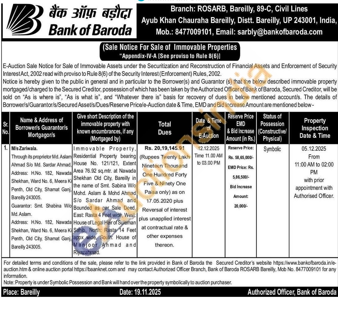 Immovable Property, Residential Property bearing House No. 121/121, Extent Area 76.92 sq.mtr. at Nawada Shekhan Old City, Bareilly in the name of Smt. Sabina W/o Mohd. Aslam & Mohd Ahmad S/o Sardar Ahmad and Bounded as per Sale Deed, East: Rasta 4 Feet wide, West: House of Legal Heir of Suleman Sahib, North: Rasta 14 Feet appx wide, South: House of Manjoor Ahmad and Riyazahmad.