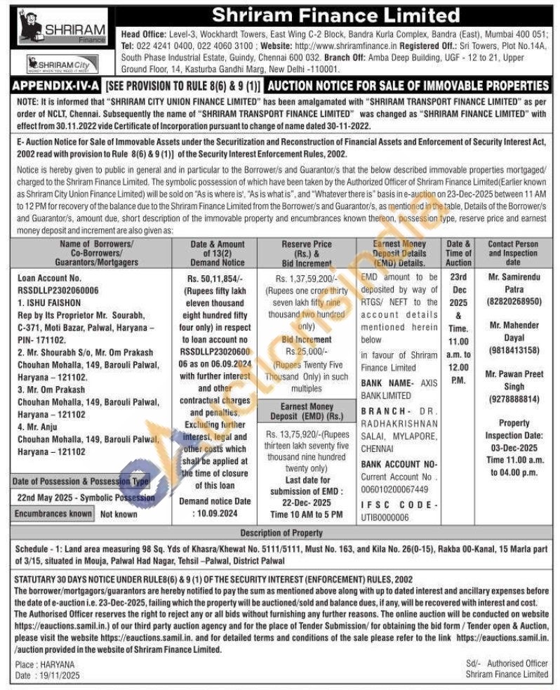 Schedule-1: Land area measuring 98 Sq. Yds of Khasra/Khewat No. 5111/5111, Must No. 163, and Kila No. 26(0-15), Rakba 00-Kanal, 15 Marla part of 3/15, situated in Mouja, Palwal Had Nagar, Tehsil -Palwal, District Palwal