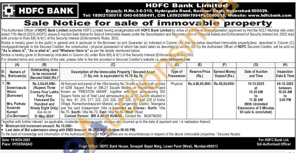 All that part and parcel of the Villa bearing No.74 with a Super built up area of 4254 Square Feet or 395.21 Square Meters, in Residential Project Known as "PRESTON AMARI", together with land admeasuring 350 Square Yards out of Total Land admeasuring Ac 22-17 Guntas situated in Sy. Nos. 91, 216, 217, 222, 223, 224, 225, 226, 227 and 228 of Kollur Village, Ramachandrapuram Mandal, and Sangareddy District, Telangana and the said Independent Villa is bounded as follows: North: VillaNo.75, South: Villa No.73, East: Villa No.66, West: Road. Contact Person: MR A ARUN KUMAR - Contact No. 9426794593