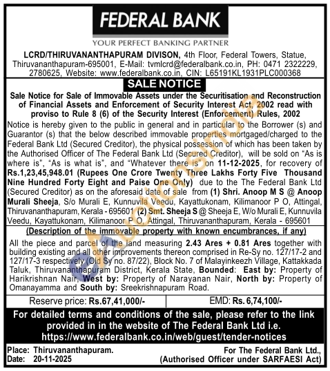 All the piece and parcel of the land measuring 2.43 Ares + 0.81 Ares together with building existing and all other improvements thereon comprised in Re-Sy no. 127/17-2 and 127/17-3 respectively (Old Sy no. 87/22), Block No. 7 of Malayinkeezh Village, Kattakkada Taluk, Thiruvananthapuram District, Kerala State, Bounded: East by: Property of Harikrishnan Nair, West by: Property of Narayanan Nair, North by: Property of Omanayamma and South by: Sreekrishnapuram Road.