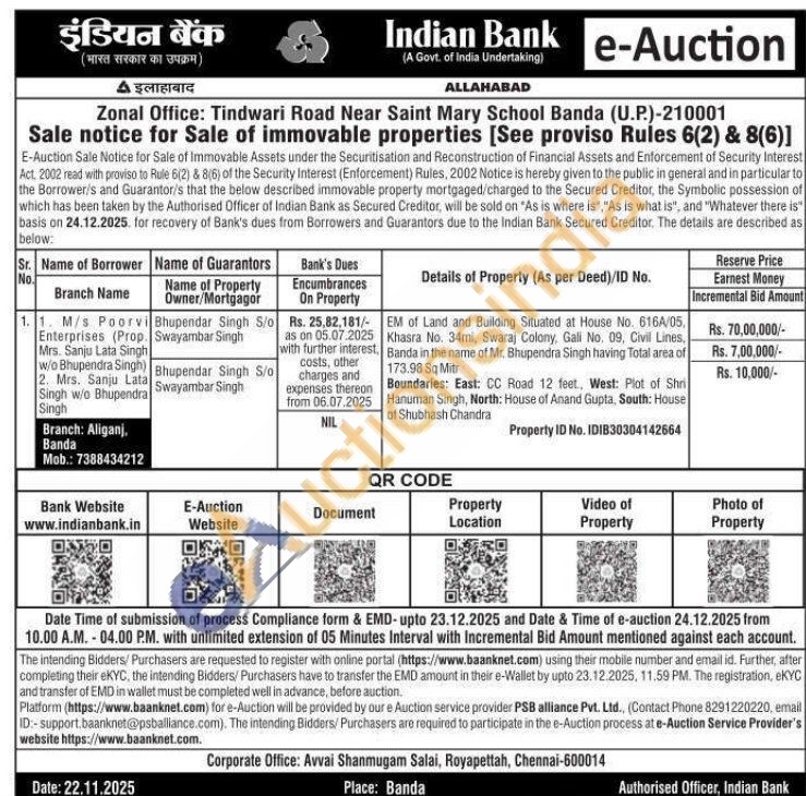 EM of Land and Building Situated at House No. 616A/05, Khasra No. 34mi, Swaraj Colony, Gali No. 09, Civil Lines, Banda in the name of Mr. Bhupendra Singh having Total area of 173.98 Sq Mitr Boundaries: East: CC Road 12 feet., West: Plot of Shri Hanuman Singh, North: House of Anand Gupta, South: House of Shubhash Chandra
