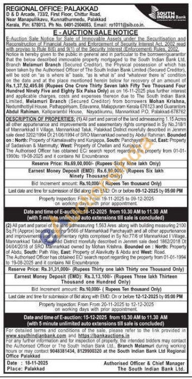 All part and parcel of the land admeasuring 1.563 Ares along with building measuring 2100 Sq.Ft (Approx) bearing door no 9/566 of Mannarkkad Panchayath and all other appurtenance and improvements and easementary rights comprised in Sy No.77/6 of Manınarkkad 1 Village, Mannarkkad Taluk, Palakkad District morsfully described in Jenmm sale deed 1862/2018 DI 04/04/2018 of SRO Mannarkkad owned by Mohan Krishna. Bounded on: North: Property of Abdu, South: Path Way, East: Property of Alavikutty & Abdu and West: Road The Authorised Officer has obtained EC/ search report regarding the property from 01-01-1994 to 19-08-2025 and it contains Nil Encumbrance