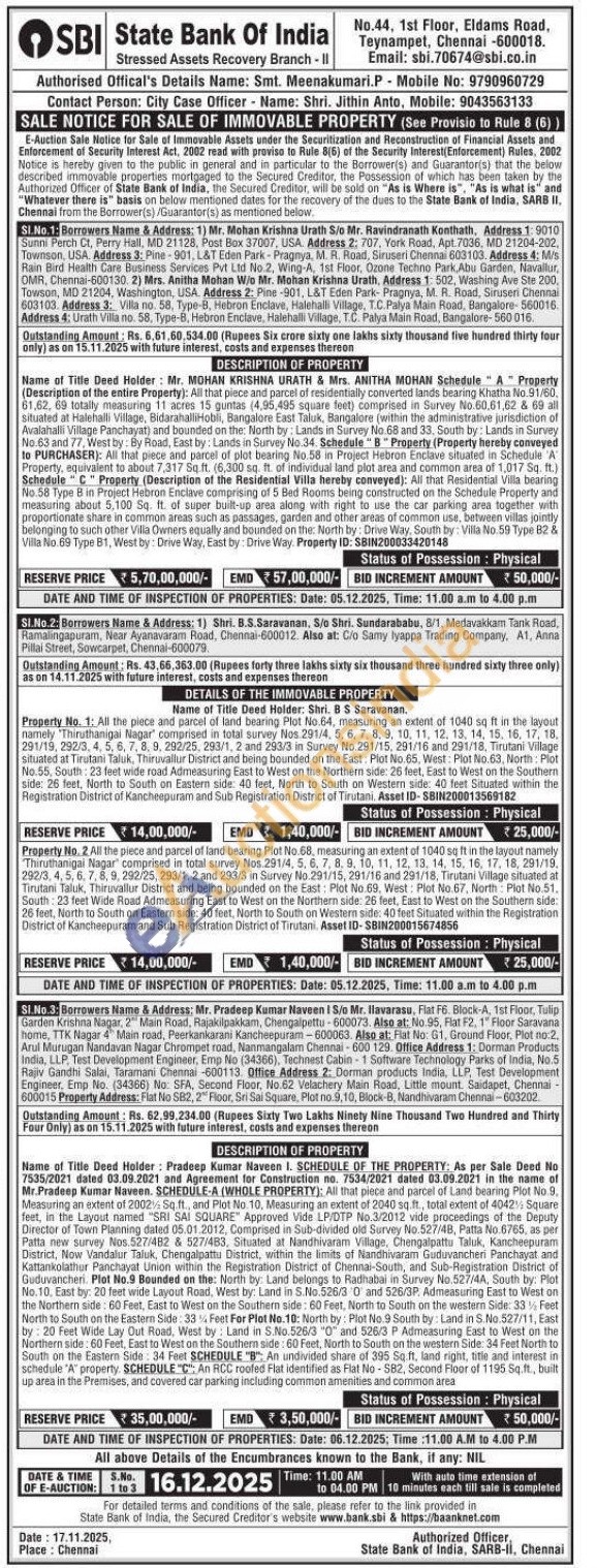 All that piece and parcel of residentially converted lands bearing Khatha No.91/60. 61,62, 69 totally measuring 11 acres 15 guntas (4,95,495 square feet) comprised in Survey No.60,61,62 & 69 all situated at Halehalli Village, BidarahalliHobli, Bangalore East Taluk, Bangalore (within the administrative jurisdiction of Avalahalli Village Panchayat) and bounded on the: North by: Lands in Survey No.68 and 33. South by: Lands in Survey No.63 and 77, West by: By Road, East by: Lands in Survey No 34. Schedule"B" Property (Property hereby conveyed to PURCHASER): All that piece and parcel of plot bearing No.58 in Project Hebron Enclave situated in Schedule 'A' Property, equivalent to about 7,317 Sq.ft. (6,300 sq. ft. of individual land plot area and common area of 1,017 Sq. ft.) Schedule "C" Property (Description of the Residential Villa hereby conveyed): All that Residential Villa bearing No.58 Type B in Project Hebron Enclave comprising of 5 Bed Rooms being constructed on the Schedule Property and measuring about 5,100 Sq. ft. of super built-up area along with right to use the car parking area together with proportionate share in common areas such as passages, garden and other areas of common use, between villas jointly belonging to such other Villa Owners equally and bounded on the: North by: Drive Way, South by: Villa No.59 Type B2 & Villa No.69 Type B1, West by: Drive Way, East by: Drive Way. Property ID: SBIN200033420148