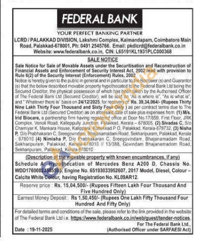 Schedule A: Hypothecation of Mercedes Benz A200 D, Chassis No. WDD1760082J585585, Engine No. 65193033952607, 2017 Model, Diesel, Colour -Calcite White Colour, having Registration No. KL09AR12