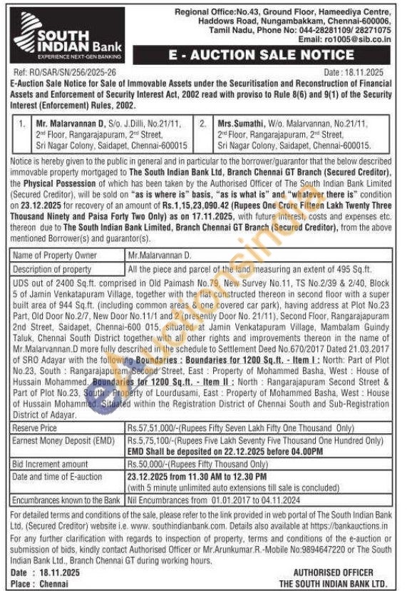 All the piece and parcel of the land measuring an extent of 495 Sq.ft. UDS out of 2400 Sq.ft. comprised in Old Paimash No.79, New Survey No.11, TS No.2/39 & 2/40, Block 5 of Jamin Venkatapuram Village, together with the flat constructed thereon in second floor with a super built area of 944 Sq.ft. (including common areas & one covered car park), having address at Plot No.23 Part, Old Door No.2/7, New Door No.11/1 and 2 (presently Door No. 21/11), Second Floor, Rangarajapuram 2nd Street, Saidapet, Chennai-600 015, situated at Jamin Venkatapuram Village, Mambalam Guindy Taluk, Chennai South District together with all other rights and improvements thereon in the name of Mr.Malarvannan.D more fully described in the schedule to Settlement Deed No.670/2017 Dated 21.03.2017 of SRO Adayar with the following Boundaries: Boundaries for 1200 Sq.ft. Item 1: North: Part of Plot No.23, South Rangarajapuram Second Street, East Property of Mohammed Basha, West: House of Hussain Mohammed. Boundaries for 1200 Sq.ft. Item II: North: Rangarajapuram Second Street & Part of Plot No.23, South Property of Lourdusami, East: Property of Mohammed Basha, West House of Hussain Mohammed. Situated within the Registration District of Chennai South and Sub-Registration District of Adayar.