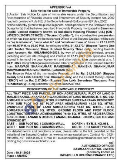 ALL THAT PIECE AND PARCEL OF NON AGRICULTURAL PLOT OF LAND IN MAUJE BAKROL, ANAND, LYING AND BEING AT LAND BEARING R. S. NO. 982, ADMEASURING 2529.00 SQ. MTRS. KNOWN AS SHREE NARAYAN RESIDENCY, PAIKI SUB PLOT NO. 03, PLOT AREA ADMEASURING 41.26 SQ. MTRS UNDIVIDED SHARE OF LAND ADMEASURING 18.65 SQ. MTRS., TOTAL ADMEASURING 59.91 SQ. MTRS., GROUND FLOOR AND FIRST FLOOR, CONSTRUCTION AREA ADMEASURING 76.00 SQ. MTRS. AT REGISTRATION SUB DISTRICT ANAND & DISTRICT ANAND, GUJARAT-388315