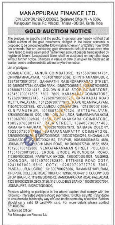 Manappuram Finance Ltd Gold Auctions Auction in Thrissur