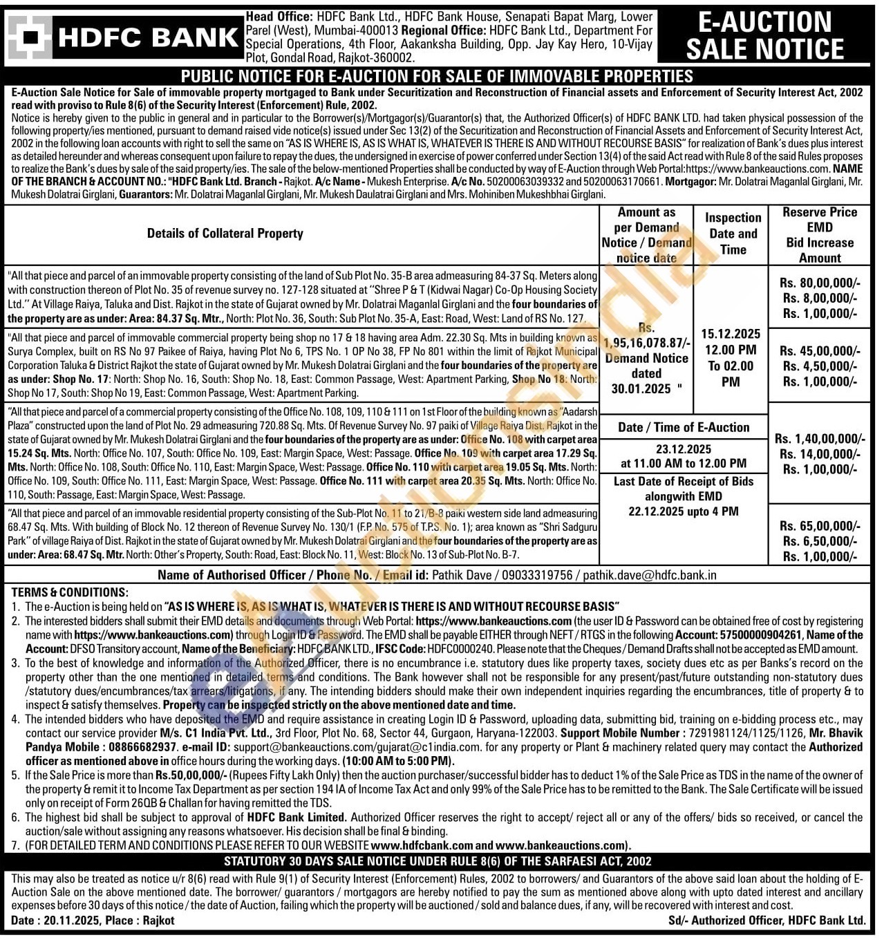 "All that piece and parcel of immovable commercial property being shop no 17 & 18 having area Adm. 22.30 Sq. Mts in building known as Surya Complex, built on RS No 97 Paikee of Raiya, having Plot No 6, TPS No. 1 OP No 38, FP No 801 within the limit of Rajkot Municipal Corporation Taluka & District Rajkot the state of Gujarat owned by Mr. Mukesh Dolatrai Girglani and the four boundaries of the property are as under: Shop No. 17: North: Shop No. 16, South: Shop No. 18, East: Common Passage, West: Apartment Parking, Shop No 18: North: Shop No 17, South: Shop No 19, East: Common Passage, West: Apartment Parking.
