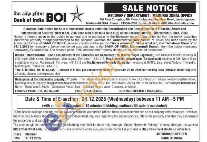 Property: The residential house property situated at No 6 Edamelaiyur 1 Village. Needamangalam Taluk, Mannargudi Sub-Registry, Nagapattinam Registration District, Survey No. 114/6F, 0.20.0 Ares, 200 sq.mtr., in the name of Mr. D Arivazhagan Boundaries: North-Theru Veethi, South Subbaiyan Punjai, East - Dhanabal Manai, West- Gunasekaran Manai.