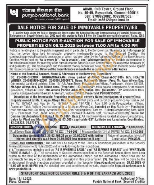 All that plece and parcel of property comprised in Old Sy. No. 19/1A2A and New Sy. No. 19/1A2A1A and 19/1A2B in Acre 2.01 cents, Poyyapakkam Village, Arakonam Taluk, Vellore District belonging to Mr.Agan Allwyn Das, bounded on the: North by-Panchayat road and saw mill, South by-Amudhu Porkon Arasi housing flats, East by-Ruban Doss housing flats, West by Panchayat road. Total: Acre 2.01Cents (19/1A2A1A-44036 sqft, 19/1A2B-43600sqft). Value for Commercial/Industrial L. & B: Rs.1,99.75.000/-, Item 2: All machinery items located at above Unit address, Value for Plant and Machineries: Rs.42,03,000+ applicable GST. Latitude and Longitudes Coordinates: 13.038222, 79.673278,