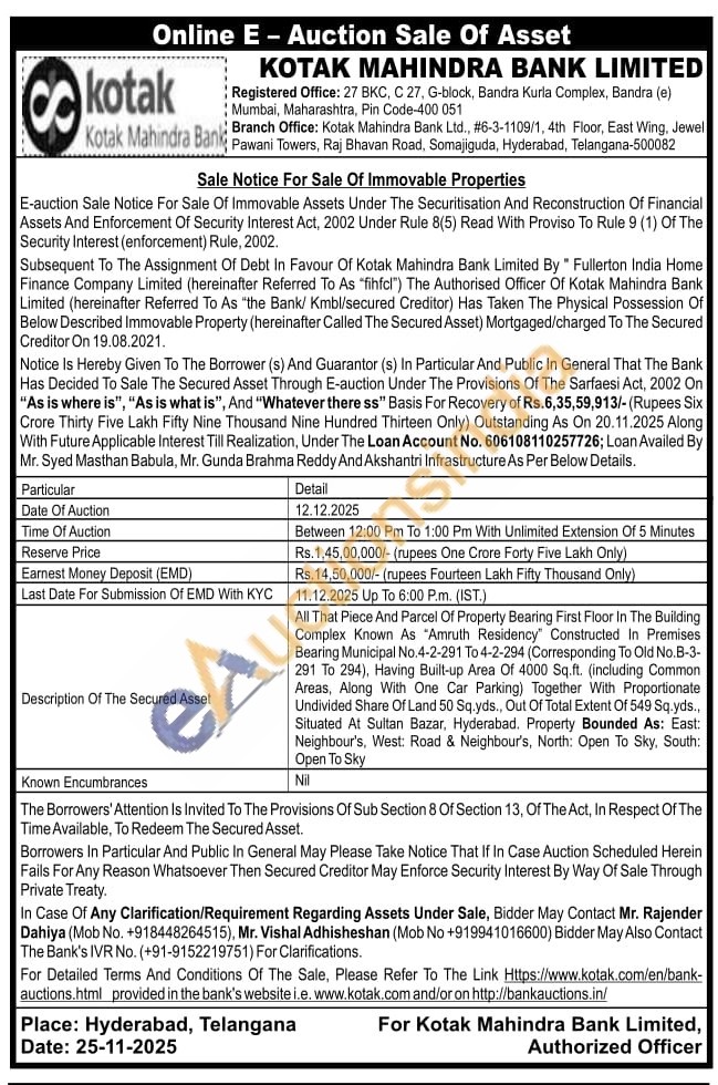 All That Piece And Parcel Of Property Bearing First Floor In The Building Complex Known As "Amruth Residency Constructed In Premises Bearing Municipal No.4-2-291 To 4-2-294 (Corresponding To Old No.B-3-291 To 294), Having Built-up Area Of 4000 Sq.ft. (including Common Areas, Along With One Car Parking) Together With Proportionate Undivided Share Of Land 50 Sq.yds., Out Of Total Extent Of 549 Sq.yds., Situated At Sultan Bazar, Hyderabad. Property Bounded As: East: Neighbour's, West: Road & Neighbour's, North: Open To Sky, South: Open To Sky