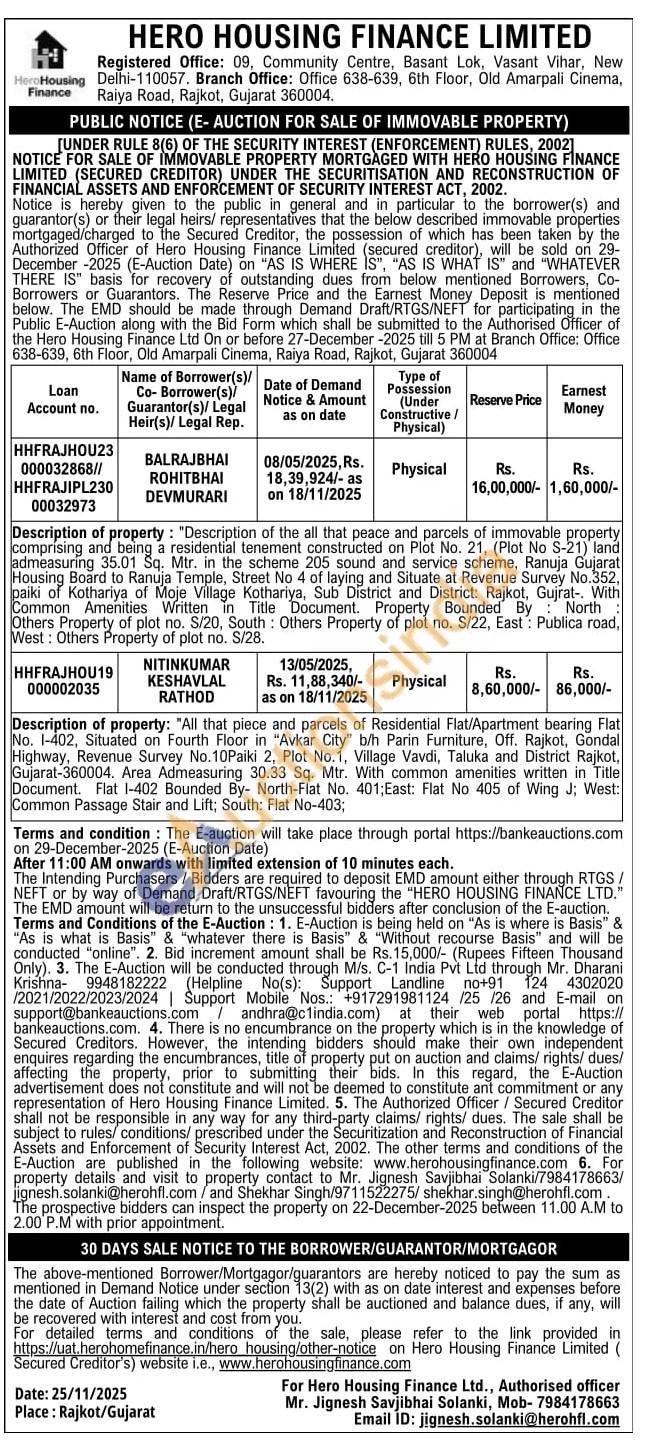 All that piece and parcels of Residential Flat/Apartment bearing Flat No. 1-402, Situated on Fourth Floor in "Avkar City" b/h Parin Furniture, Off. Rajkot, Gondal Highway, Revenue Survey No.10Paiki 2, Plot No.1, Village Vavdi, Taluka and District Rajkot, Gujarat-360004. Area Admeasuring 30.33 Sq. Mtr. With common amenities written in Title Document. Flat 1-402 Bounded By- North-Flat No. 401; East: Flat No 405 of Wing J; West: Common Passage Stair and Lift; South: Flat No-403;