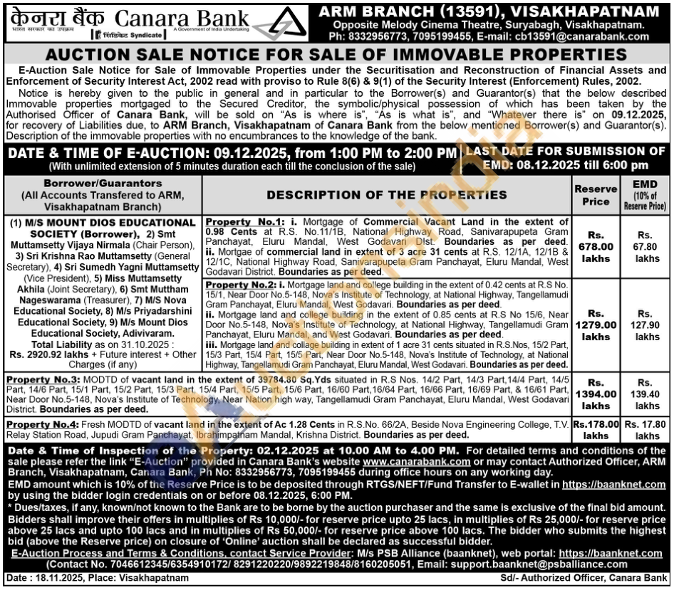 ii. Mortgage land and college building in the extent of 0.85 cents at R.S No 15/6, Near Door No.5-148, Nova's Institute of Technology, at National Highway, Tangellamudi Gram Panchayat, Eluru Mandal, and West Godavari. Boundaries as per deed.