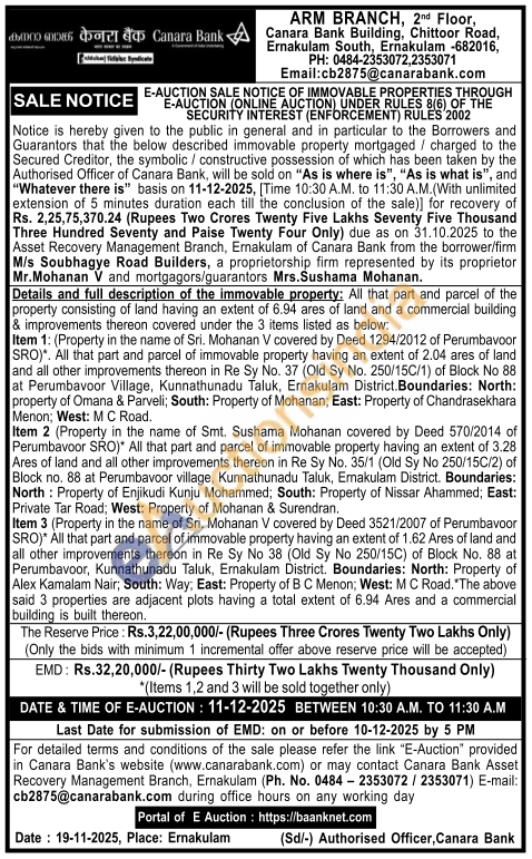 Item 3 (Property in the name of Sri. Mohanan V covered by Deed 3521/2007 of Perumbavoor SRO)* All that part and parcel of immovable property having an extent of 1.62 Ares of land and all other improvements thereon in Re Sy No 38 (Old Sy No 250/15C) of Block No. 88 at Perumbavoor, Kunnathunadu Taluk, Ernakulam District. Boundaries: North: Property of Alex Kamalam Nair; South: Way; East: Property of B C Menon; West: M C Road. "The above said 3 properties are adjacent plots having a total extent of 6.94 Ares and a commercial building is built thereon
