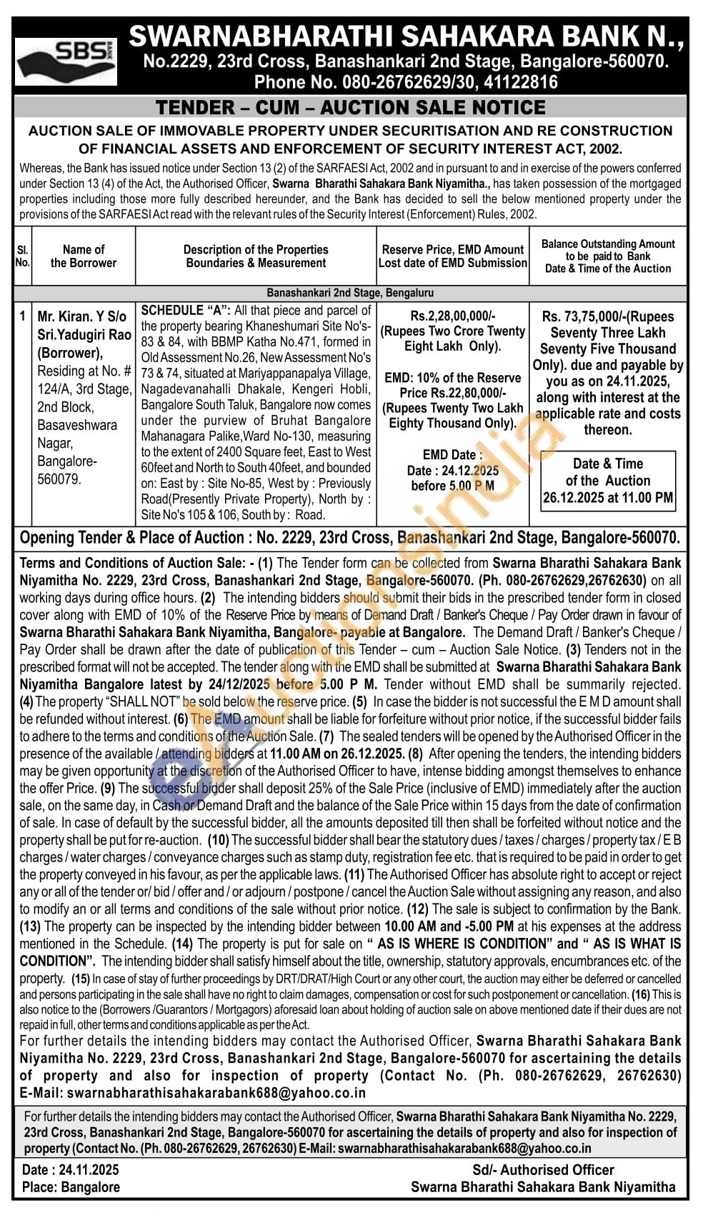Contact No. (Ph. 080-26762629, 26762630) E-Mail: swarnabharathisahakarabank688@yahoo.co.in