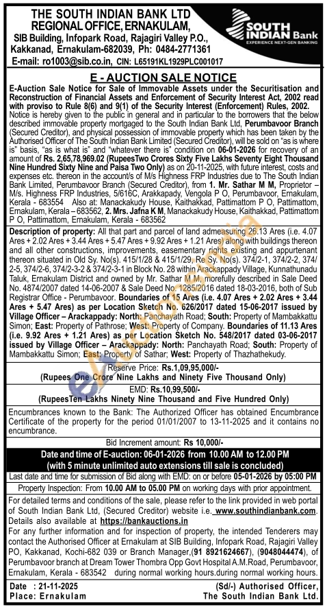 Description of property: All that part and parcel of land admeasuring 26.13 Ares (i.e. 4.07 Ares + 2.02 Ares + 3.44 Ares + 5.47 Ares + 9.92 Ares + 1.21 Ares) along with buildings thereon and all other constructions, improvements, easementary rights existing and appurtenant thereon situated in Old Sy. No(s). 415/1/28 & 415/1/29, Re Sy. No(s). 374/2-1, 374/2-2, 374/2-5, 374/2-6, 374/2-3-2 & 374/2-3-1 in Block No. 28 within Arackappady Village, Kunnathunadu Taluk, Ernakulam District and owned by Mr. Sathar M M, morefully described in Sale Deed No. 4874/2007 dated 14-06-2007 & Sale Deed No. 1285/2016 dated 18-03-2016, both of Sub Registrar Office - Perumbavoor. Boundaries of 15 Ares (i.e. 4.07 Ares + 2.02 Ares + 3.44 Ares + 5.47 Ares) as per Location Sketch No. 626/2017 dated 15-06-2017 issued by Village Officer - Arackappady: North: Panchayath Road; South: Property of Mambakkattu Simon; East: Property of Pathrose; West: Property of Company. Boundaries of 11.13 Ares (i.e. 9.92 Ares + 1.21 Ares) as per Location Sketch No. 548/2017 dated 03-06-2017 issued by Village Officer - Arackappady: North: Panchayath Road; South: Property of Mambakkattu Simon; East: Property of Sathar; West: Property of Thazhathekudy