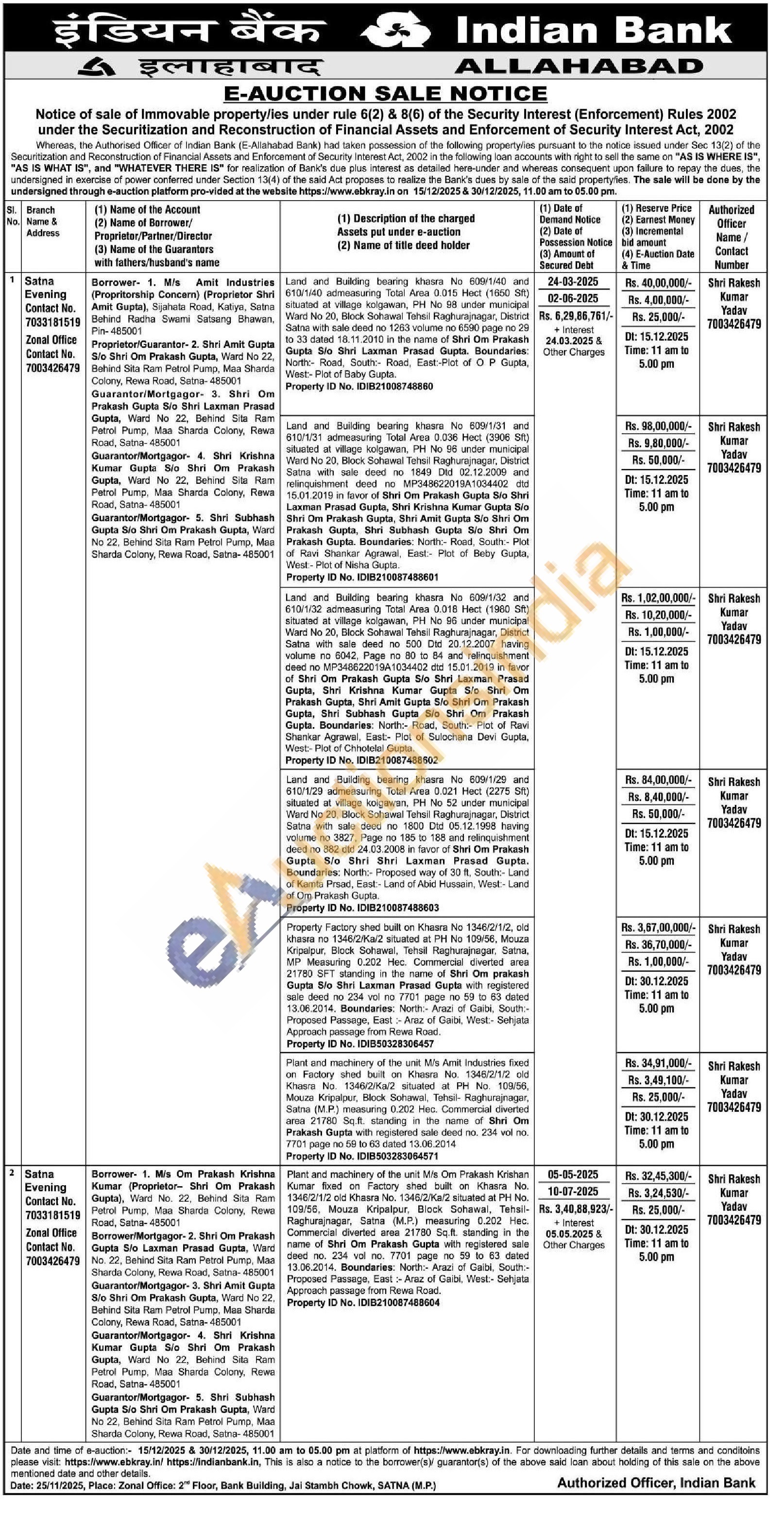 Plant and machinery of the unit M/s Om Prakash Krishan Kumar fixed on Factory shed built on Khasra No. 13-46/2/1/2 old Khasra No. 1346/2/Ka/2 situated at PH No. 109/56, Mouza Kripalpur, Block Sohawal, Tehsil Raghurajnagar, Satna (M.P.) measuring 0.202 Hec. Commercial diverted area 21780 Sq.ft. standing in the name of Shri Om Prakash Gupta with registered sale deed no. 234 vol no. 7701 page no 59 to 63 dated 13.06.2014, Boundaries: North:- Arazi of Gaibi, South:-Proposed Passage, East:- Araz of Gaibi, West:- Sehjata Approach passage from Rewa Road. Property ID No. IDIB210087488604
