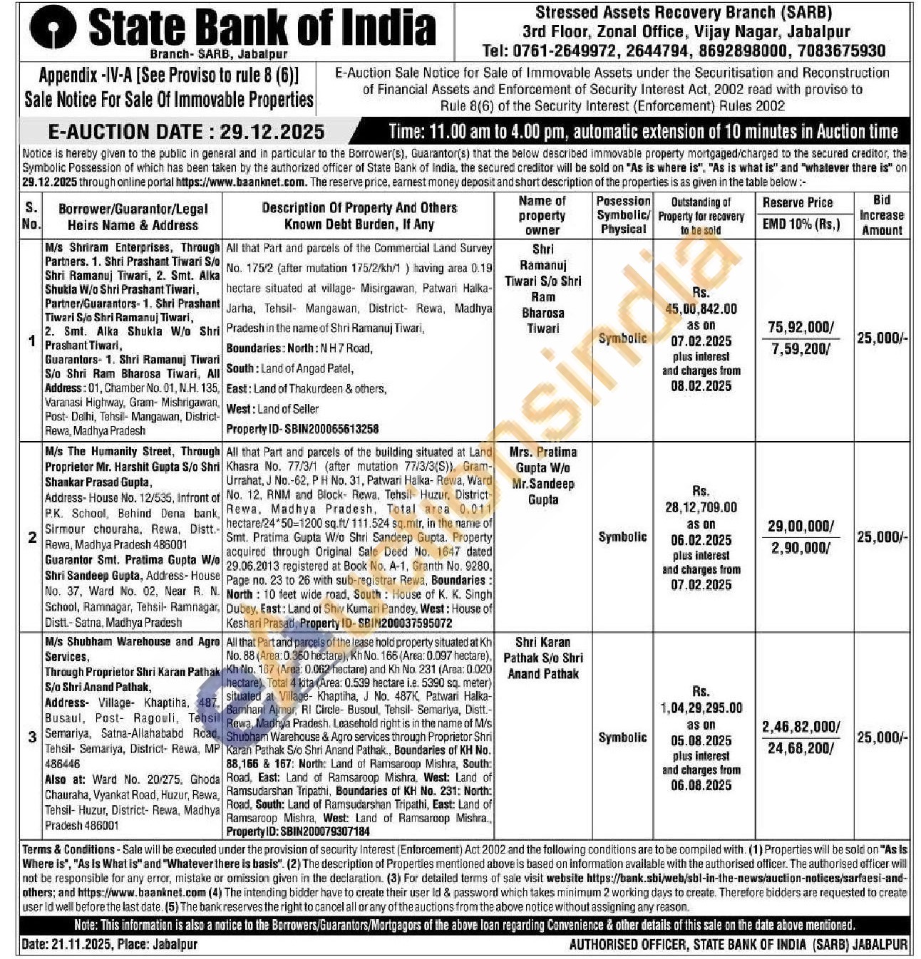 All that Part and parcels of the Commercial Land Survey No. 175/2 (after mutation 175/2/kh/1) having area 0.19 hectare situated at village- Misirgawan, Patwari Halka-Jarha, Tehsil- Mangawan, District- Rewa, Madhya Pradesh in the name of Shri Ramanuj Tiwari,
