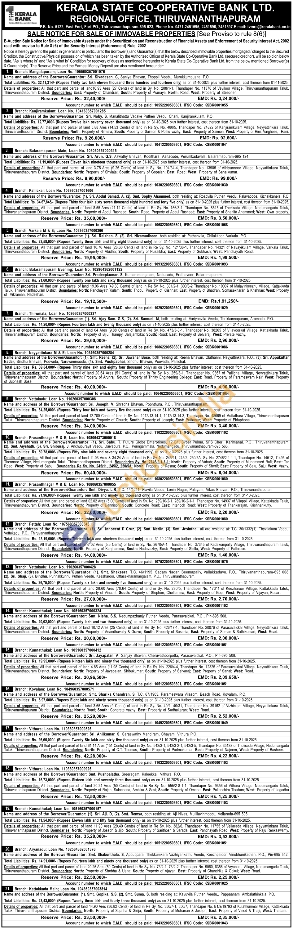 Contact No : Phone: 0471-2451595, 2451596, 2451597/ email: tvmro@keralabank.co.in.. tvmroccmr@keralabank.co.in.