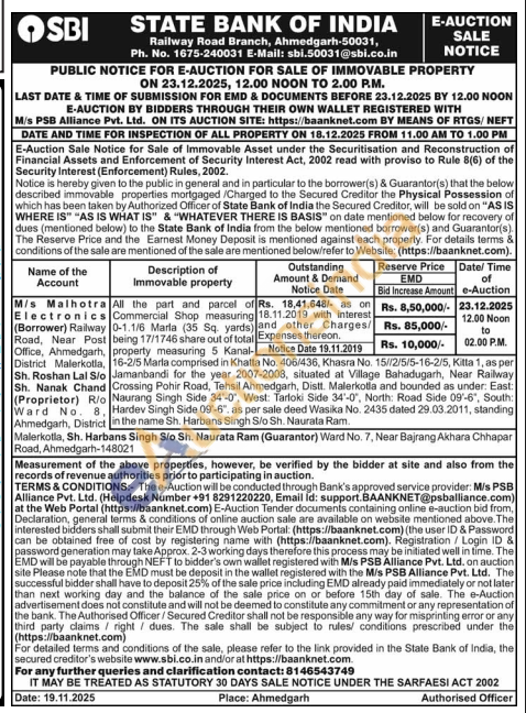 All the part and parcel of Commercial Shop measuring 0-1.1/6 Marla (35 Sq. yards) being 17/1746 share out of total property measuring 5 Kanal- 16-2/5 Marla comprised in Khatta No. 406/436, Khasra No. 15//2/5/5-16-2/5, Kitta 1, as per Jamanbandi for the year 2007-2008, situated at Village Bahadugarh, Near Railway Crossing Pohir Road, Tehsil Ahmedgarh, Distt. Malerkotla and bounded as under: East: Naurang Singh Side 34'-0", West: Tarloki Side 34'-0", North: Road Side 09'-6", South: Hardev Singh Side 09'-6". as per sale deed Wasika No. 2435 dated 29.03.2011, standing in the name Sh. Harbans Singh S/o Sh. Naurata Ram.