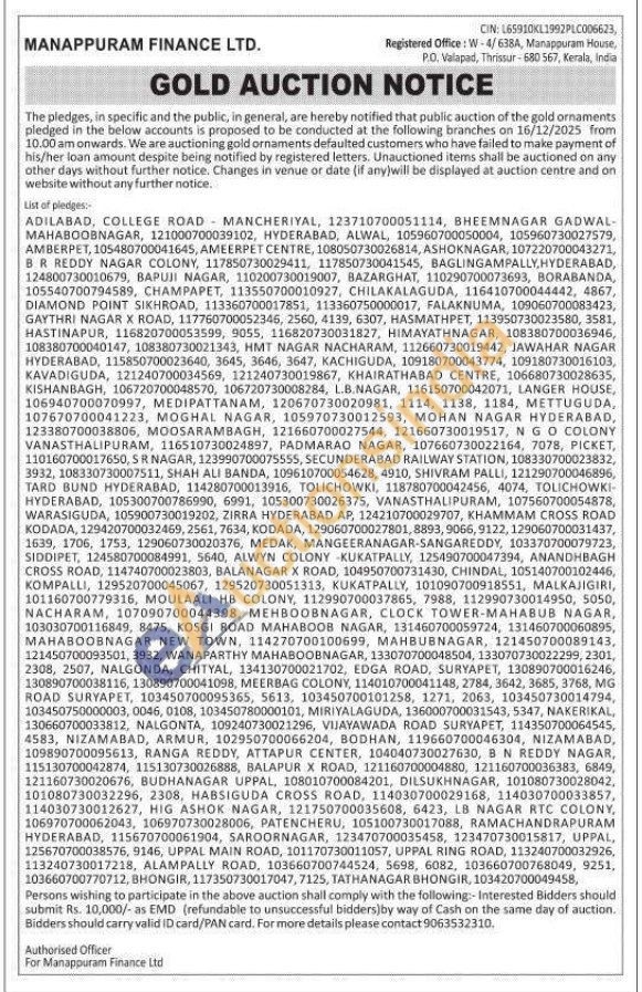Manappuram Finance Ltd Gold Auctions Auction in Adilabad