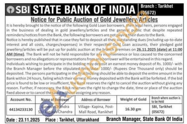 State Bank of India Gold Auctions Auction in Uttara Kannada