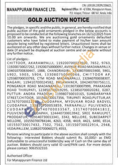 Manappuram Finance Ltd Gold Auctions Auction in Chittoor