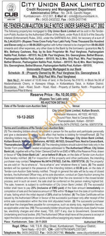 Schedule-B: (Property Owned by Mr. Paul Varghese S/o. Geevarghese & Mrs. Shiji Paul W/o. Paul Varghese) : Item No.2: An extent of 10.80 Ares of land, in Re-Survey No.516/10, in Block No.06 of Madandhakode Cherry, in Kareepra Village, in Kottarakkara Taluk, in Kollam District. Boundaries East Road, South Road, West Property of Santha, North Properties of Sivasankara Pillai & Manoj