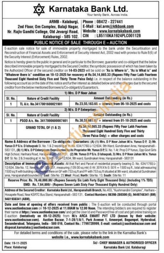 Description of Immovable Secured Assets: All that Part and Parcel of residential property bearing D. No. 634/1750/12/634, Site No. 12, New No. 17-503-201, measuring (139.00 sq.mtr) E-W: 30 ftXN-S: 50ft=1500 sq.ft., total admeasuring 1500 sq.ft with building constructed there on GF with 753 sq ft and FF with 753 sq ft situated at 9th ward, situated at Gundinakeri area, Harapanahalli bounded by: East: Site No. 23, West: Road, North: Site No. 13, South: Site No. 11