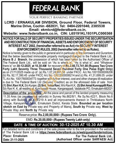 11.35 Ares (as per revenue records) in Survey No.862/8/1, Re Sy.No.422/1, Block No.6 along with Building No.XVII/219 A and all improvements thereon in Thrikkakara North Village, Kanayannur Taluk, Ernakulam Distict, Kerala State. Bounded as per location sketch on East by Private way and Property of Manoj, South by Private way, West by Private Way and North by Private way